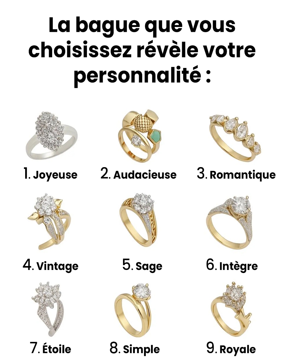 Avez-vous déjà remarqué comme certaines bagues semblent vous “appeler”, comme si elles connaissaient déjà vos secrets les plus doux ? Et si ce n’était pas un hasard ? Chaque bague raconte une histoire — celle de votre cœur, de votre énergie et de votre manière d’aimer. Laquelle, parmi ces neuf, serait la vôtre ?