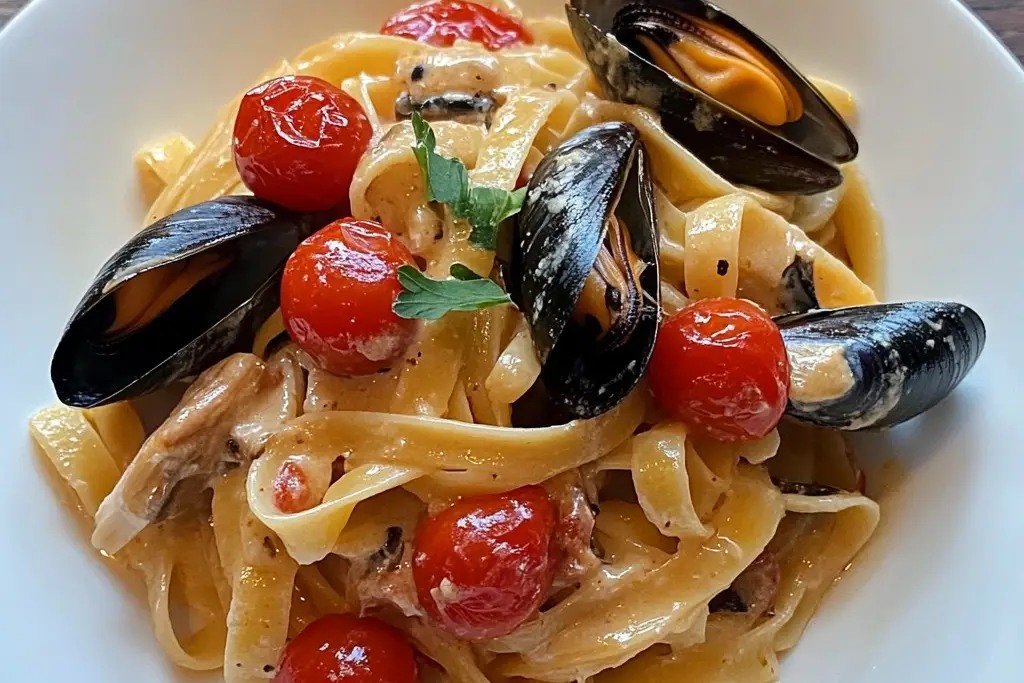 Un plat raffiné et savoureux, où les tagliatelles se marient à la perfection avec des moules fraîches et une sauce crémeuse parfumée à l’ail et au vin blanc.